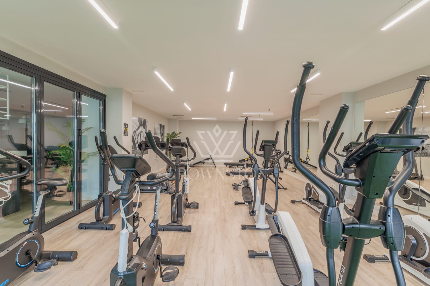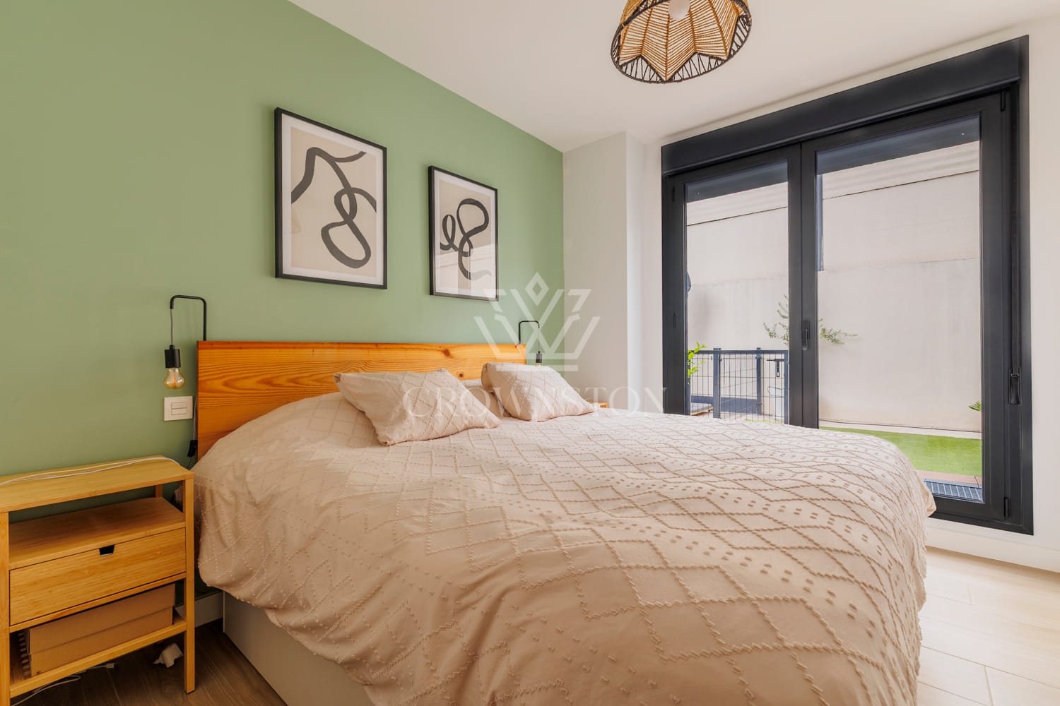 On the first floor, the property offers a spacious living-dining room with an integrated designer kitchen, three double bedrooms—all with direct access to the garden—and three full bathrooms, one of them en suite. Its spectacular 116 m² garden terrace provides a unique space for outdoor enjoyment.