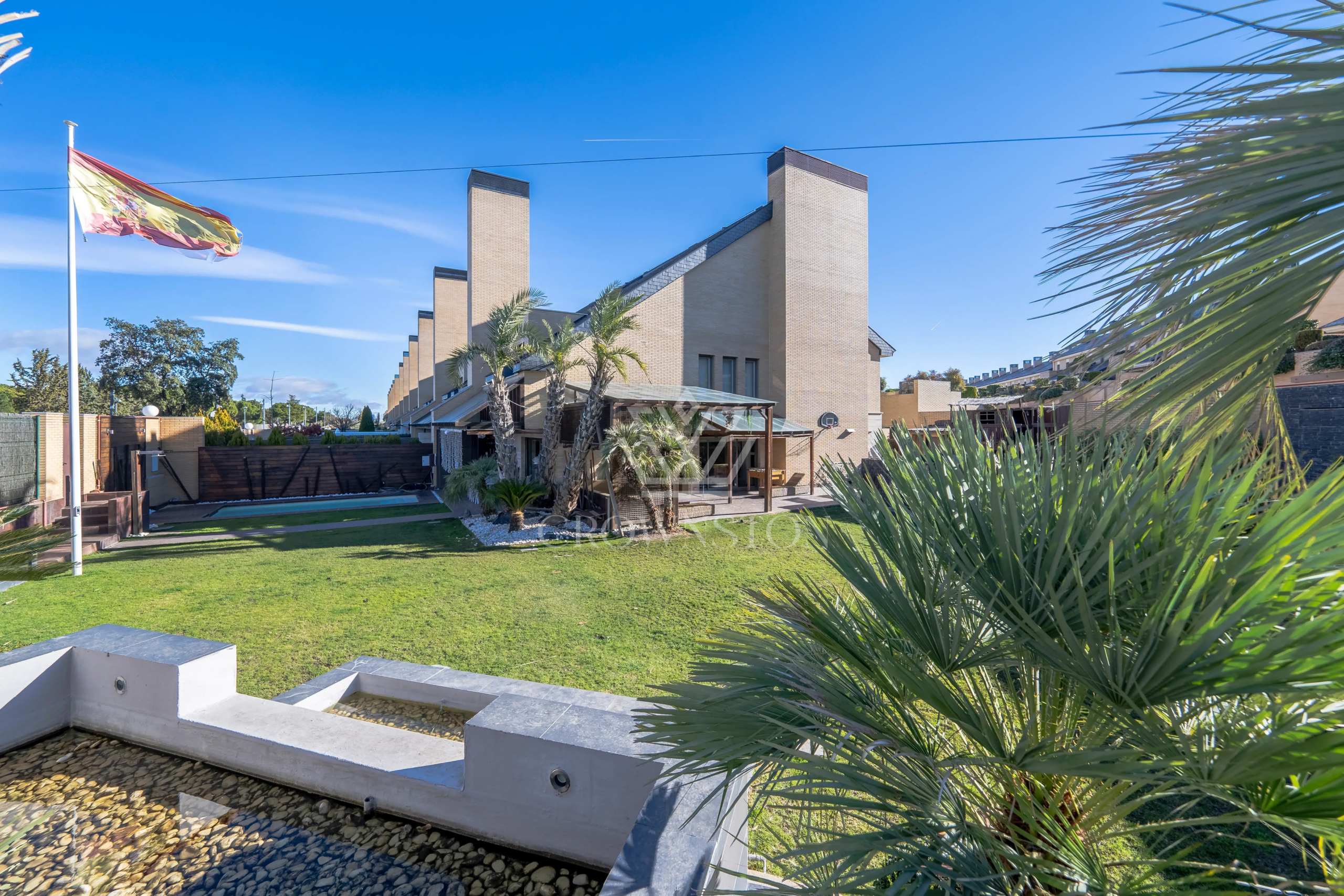 Este fantástico chalet pareado de esquina se alza sobre la parcela más extensa de la urbanización, con un jardín envolvente que evoca los paisajes más cuidados del Mediterráneo: palmeras, fuentes, cascadas, una casa de juegos independiente y una piscina exterior rodeada de zonas de descanso. Todo ello acompañado por un sistema de sonido Sonos con 12 altavoces exteriores, irrigadores integrados en los porches para refrescar las estancias en los días más cálidos, y un elegante porche de madera con acabados en microcemento y sifones incorporados.