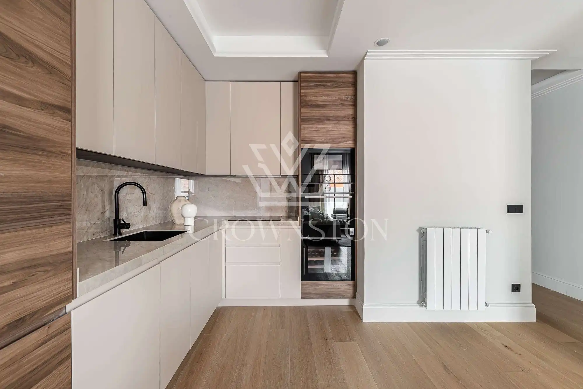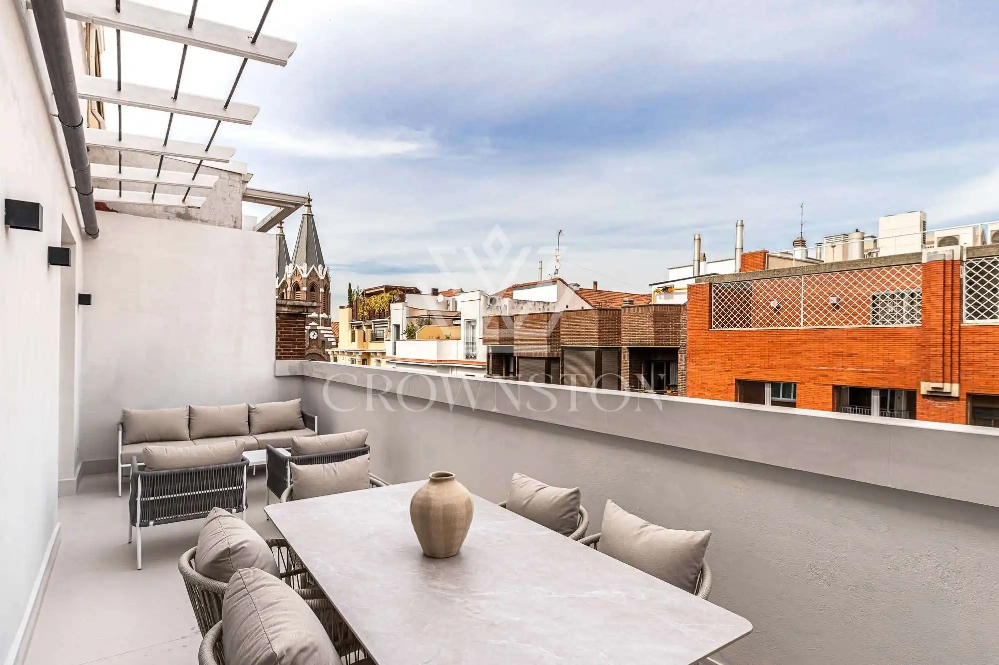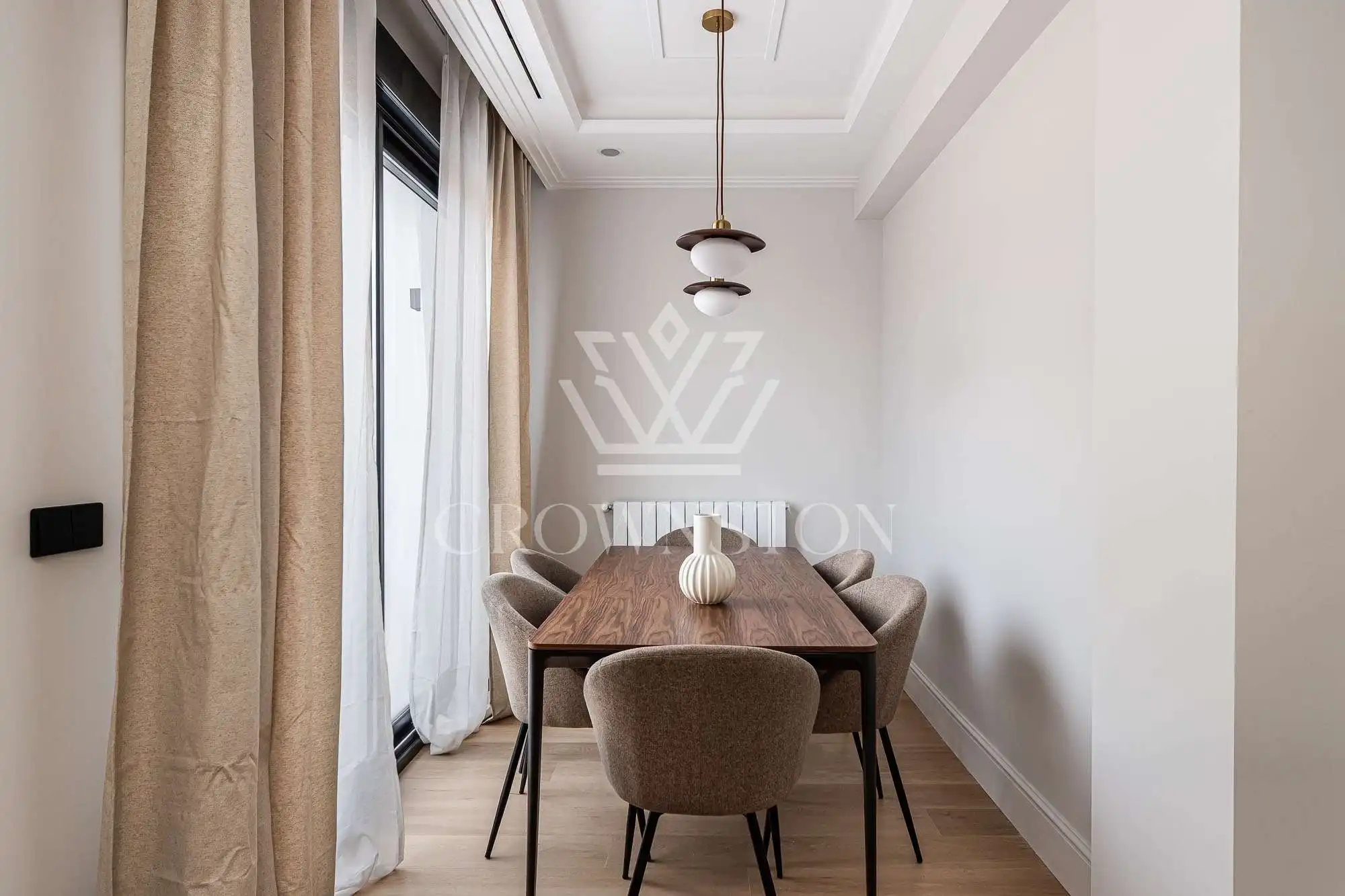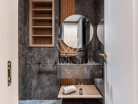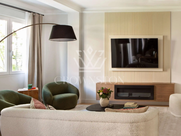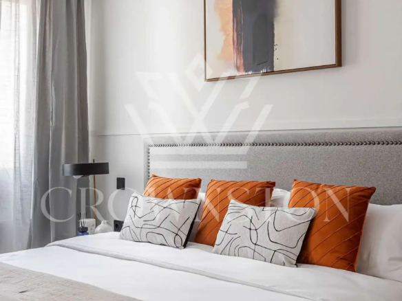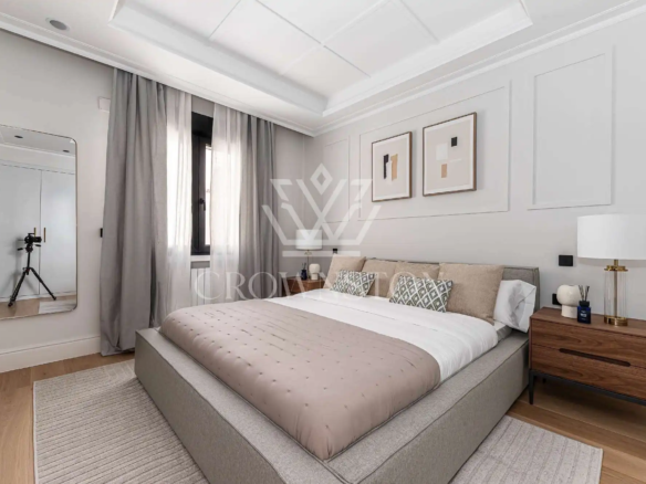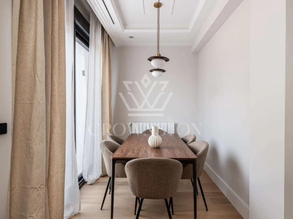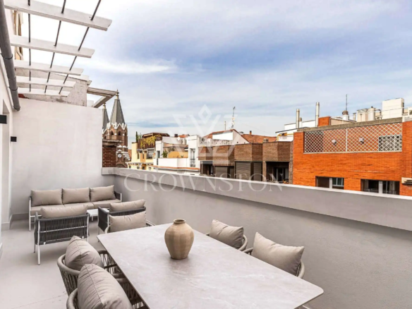 Crownston presenta esta exclusiva propiedad en Almagro, Chamberí: un ático totalmente reformado y amueblado, ubicado en la sexta planta de un edificio señorial con ascensor y servicio de conserjería.