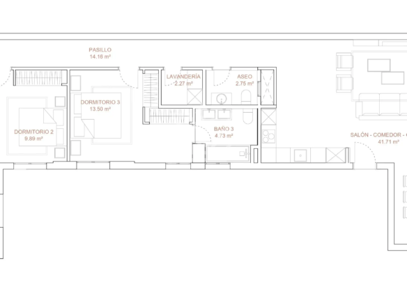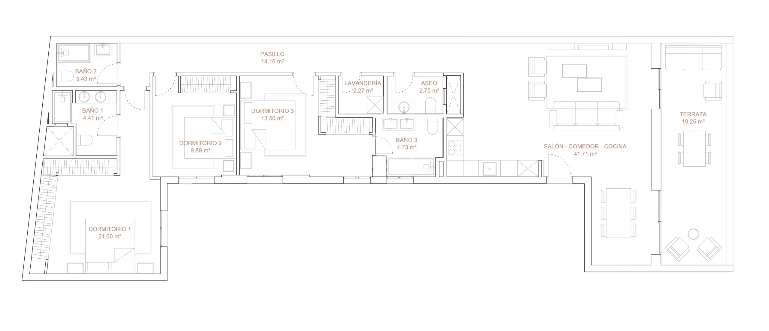 Con una superficie aproximada de 194 m², esta luminosa vivienda se distribuye en tres habitaciones, cada una con su baño en suite, además de un aseo de cortesía. La orientación sur garantiza una excelente entrada de luz natural durante todo el día, aportando calidez y confort a cada estancia.