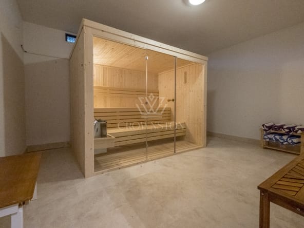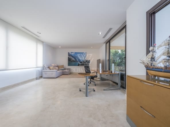 La planta inferior alberga una versátil sala diáfana concebida como espacio de bienestar y lectura, en la que actualmente se integran una biblioteca, zonas de fitness y yoga, sauna seca, sala de masajes y un cuarto de baño completo. Desde este nivel se accede directamente a los cuidados jardines y a la piscina exterior, lo que refuerza su carácter de oasis privado.