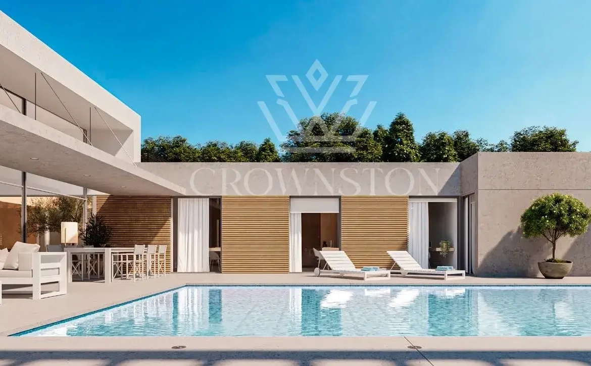 Con una cuidada orientación, cada vivienda se organiza en un solo nivel, articulada en forma de L alrededor de un jardín privado de hasta 2.500 m², donde la vegetación, el agua y la luz natural se convierten en protagonistas. La piscina, reflejo del cielo, domina el corazón de la parcela y genera un universo íntimo en total armonía con el entorno.