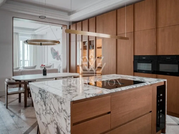El salón, con orientación sur, se convierte en el corazón de la vivienda, inundando los espacios de luz natural a lo largo del día. Esta sensación de luminosidad se prolonga hacia una espectacular cocina americana, donde la calidez de la madera natural se combina armoniosamente con la sofisticación del mármol alabastro, creando un ambiente de lujo atemporal.